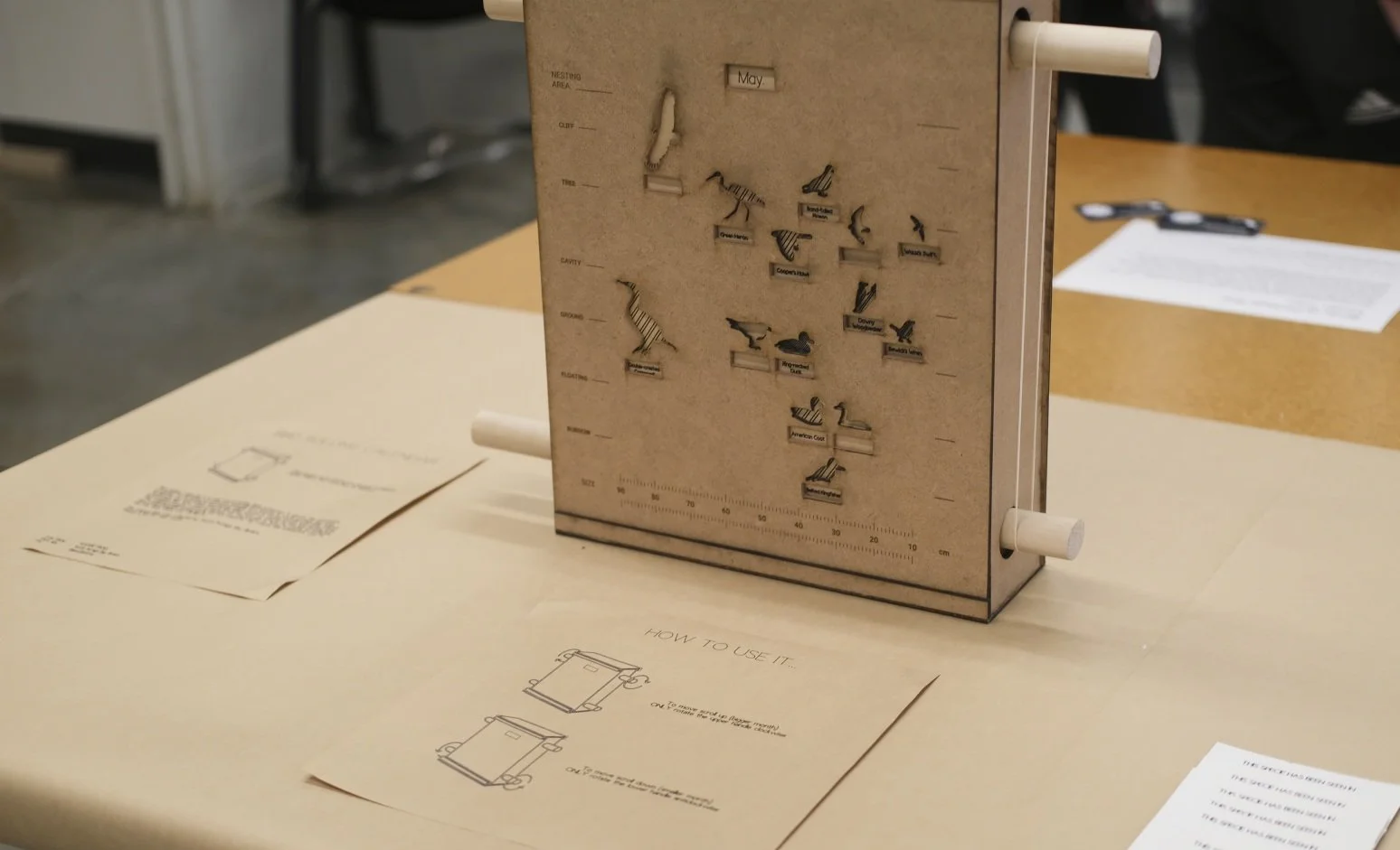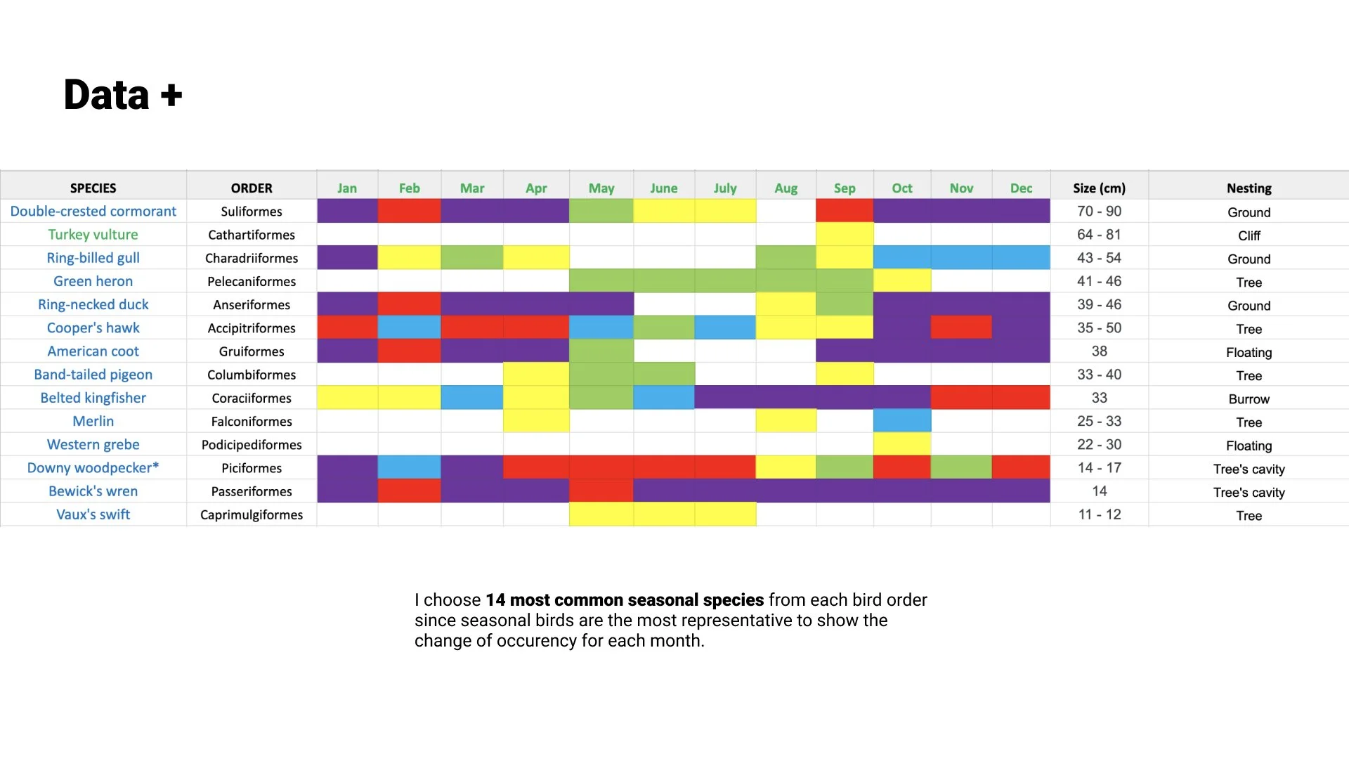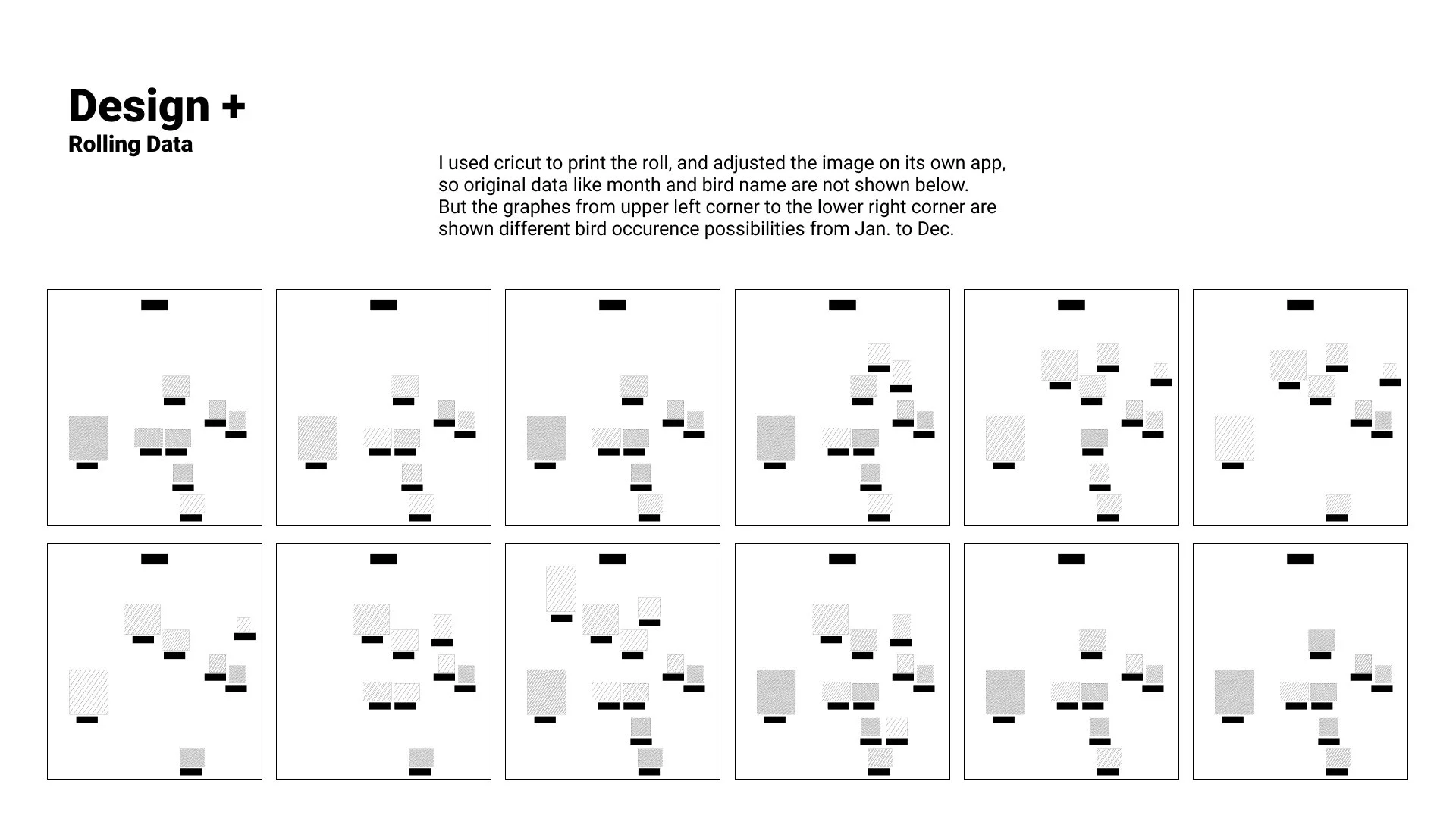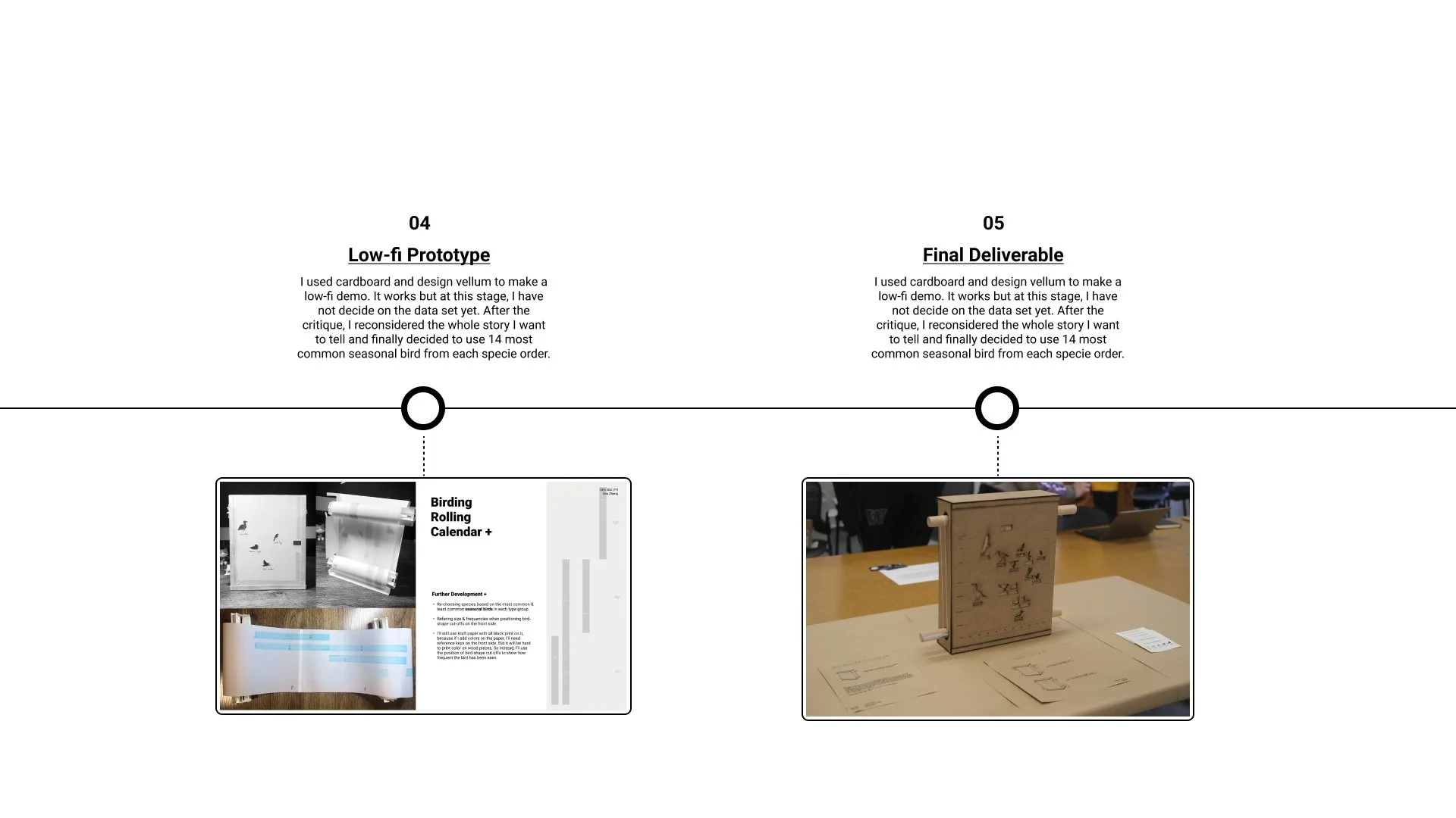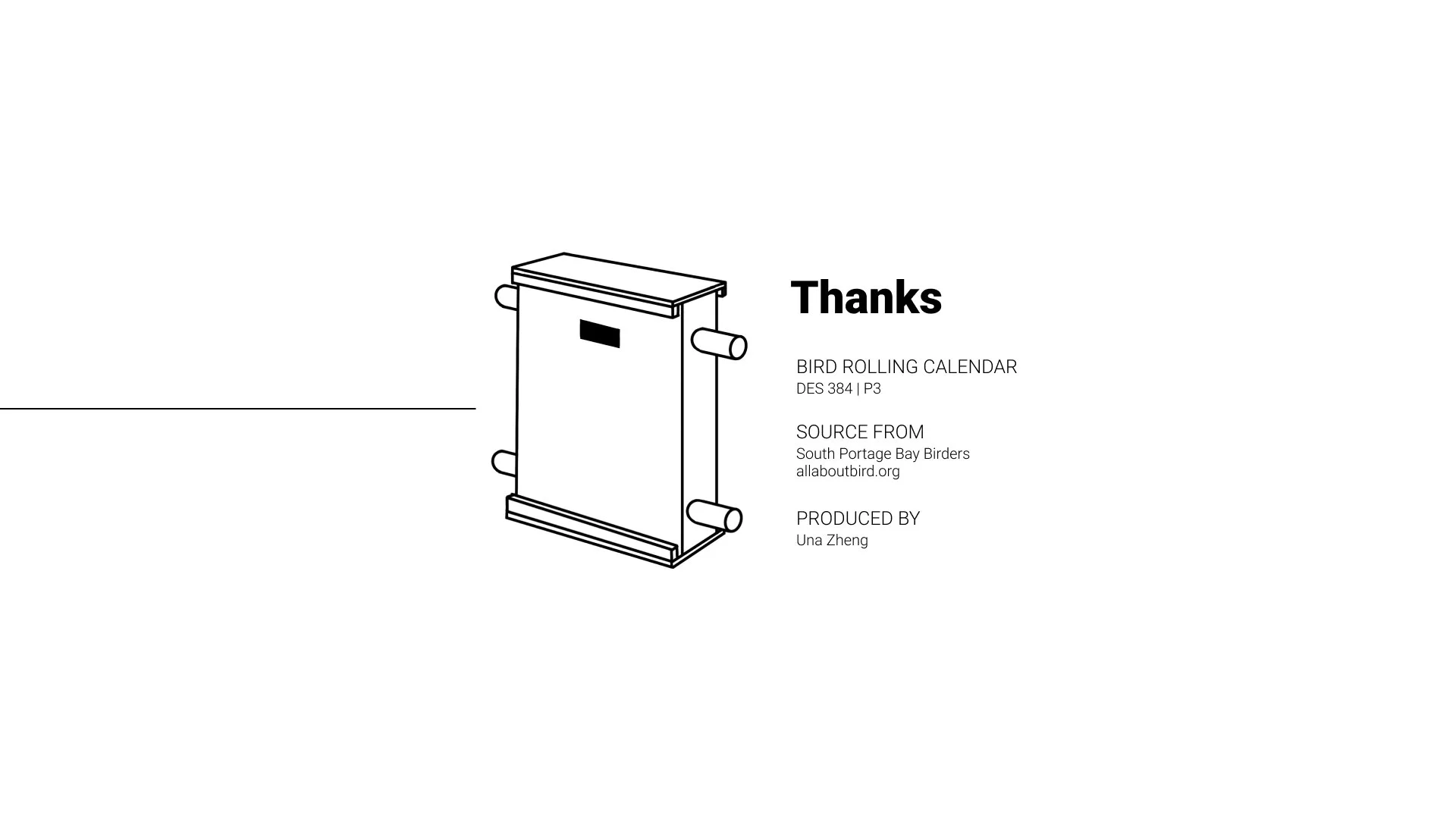 Bird Rolling Calendar is a year-round birding data presentation, an intriguing birding guide for non-experts. It shows the occurrence of 14 types of common seasonal bird species around south portage bay area at Seattle. Audiences are shown through an interactive installation which presents birding-related information like bird species occur in certain months, years the species have been seen, their sizes as well as their nesting areas.