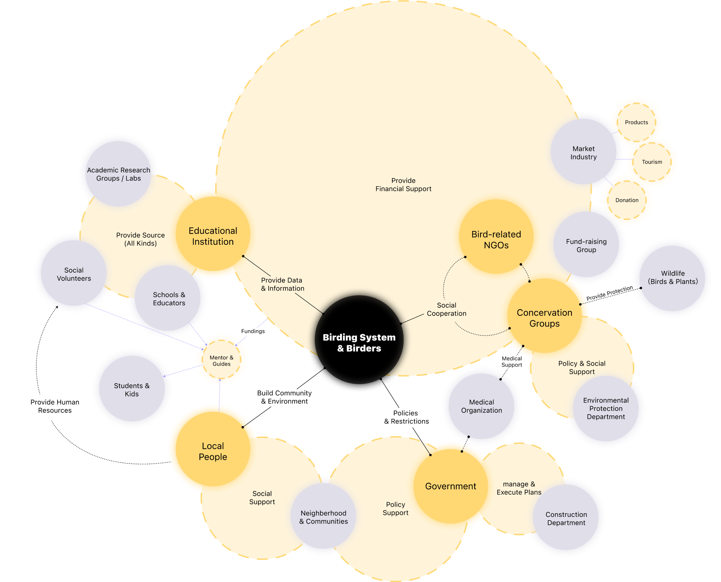 The birder and birding ecosystem consists of a complex but relatively fixed web of supply and demand relationships. The main sources of human and financial supports are local government, local community, conservation groups/NGOs, and educational institutions. In consideration of the project feasibility and scope, I chose to limit the target user group to local community/people and bird-related NGOs.