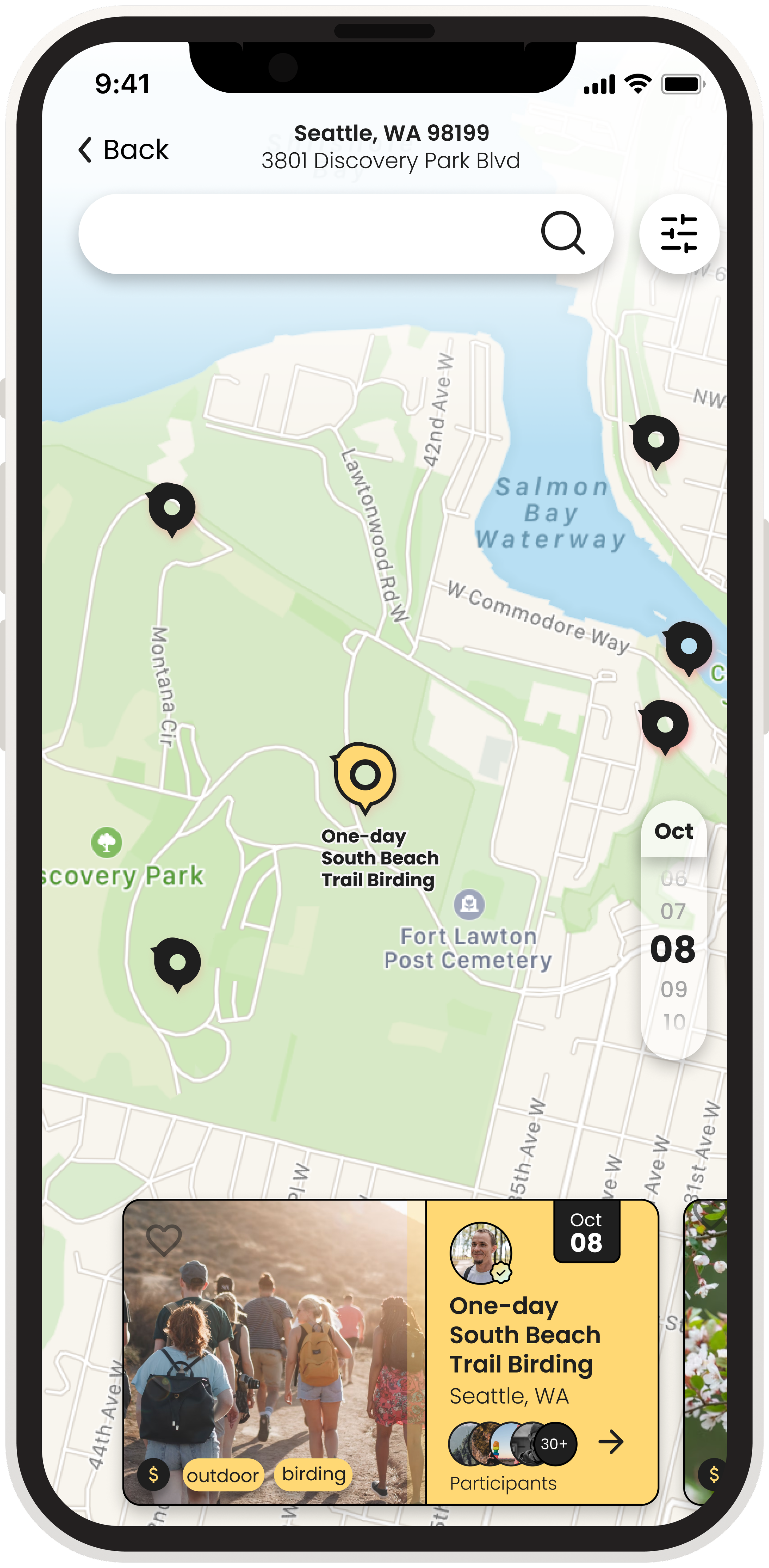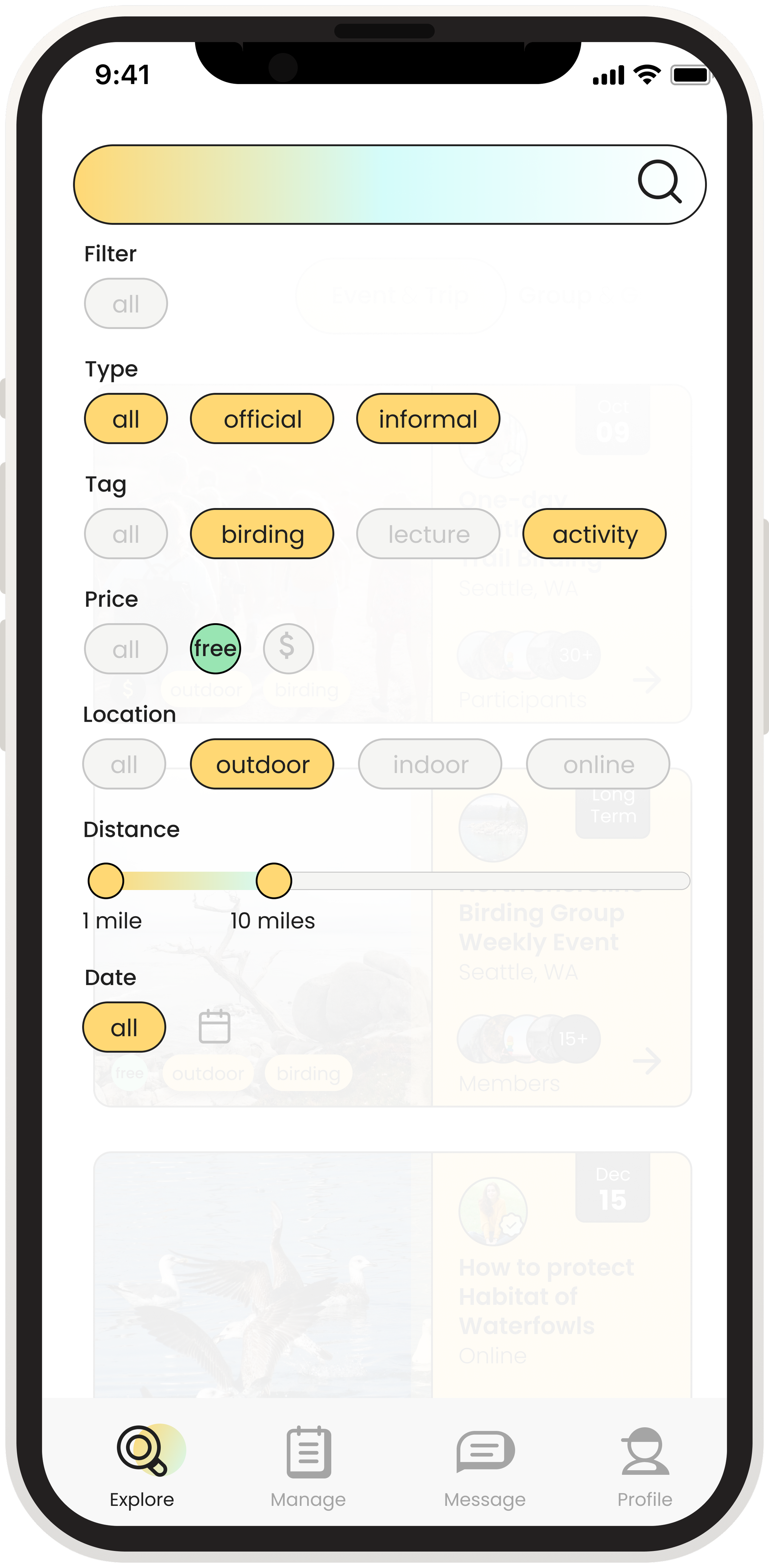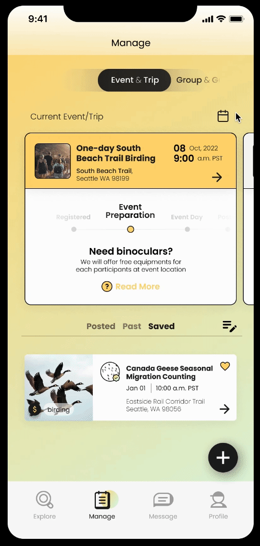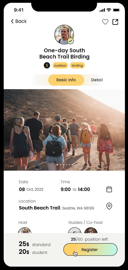 The pain points for birding participants/beginners lie in registration stage and attending stage. Since people want more involvement with the nature and and less technology distractions in the attending stage, my design mostly focused on helping participants in finding events and faster registration.
