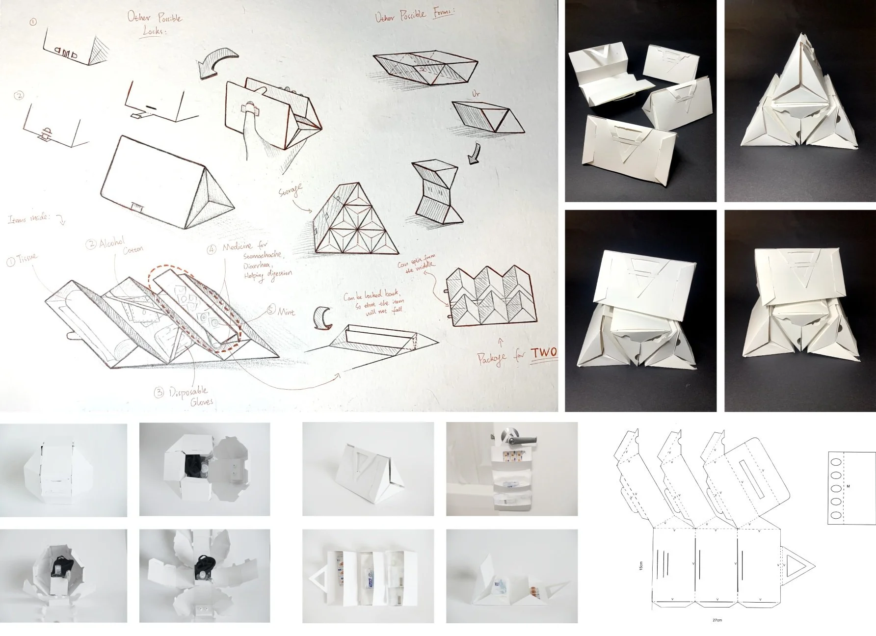 Multiple tests and iterations on external shapes, interior holding structure, openings, connections, and locks were conducted. The side opening is designed for quick access without open the entire package. The front lock is designed for easy opening and hanging.